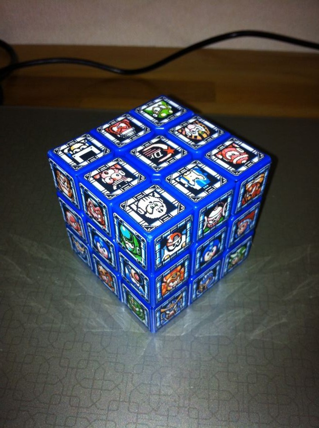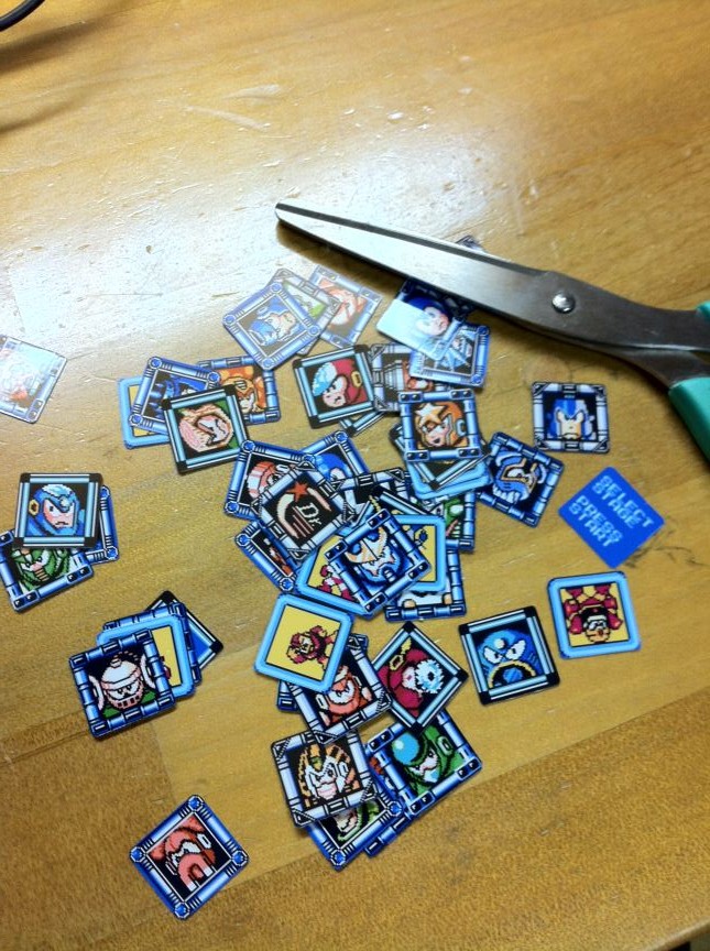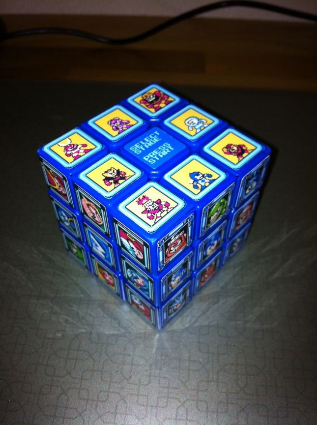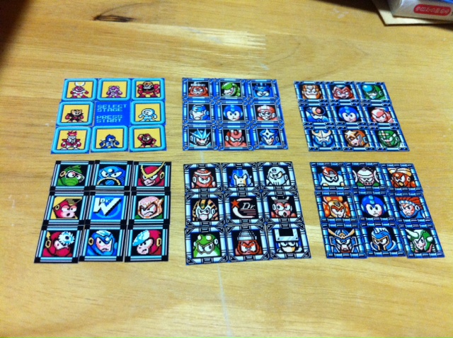 昔、親戚の家にあったロックマン5を遊んで以来ロックマンが好きな僕にはかねてよりロックマンキューブを作る構想があった。ロックマンには、キューブに適したモチーフがあるからである。そう、ステージセレクト画面だ。 ロックマン1~6までの、ファミコン期作品のステセレ画面を6面にあしらえば、なかなか見応えあり遊びごたえありのキューブになるのではなかろうかと考えていた。他に実践した人が過去にいくらいてもおかしくないだろう。ていうかCAPCOMから公式で出してほしいくらいだ。 ググってみると先達がチラホラ。 ・Mega Man Rubik’s Cube just as hard as Mega Man games ・Mega Man Boss Battle Rubik’s Cube: Still Easier to Finish Than the Video Game ・Megaman Rubik's Cube でもなんか違う。僕のイメージでは1マス=1ボスなんだよね。 てことで早速作ってみた。 以下の、おばきいさんのブログの記事を参考にしました。 痛ルービックキューブを自作しよう!(『ルービックキューブ日記』, 2011.10.15) 材料は、 ・A-oneのインクジェットプリンタラベル kaddeyさんが紹介されていたものです。どこで見たんだっけかな…… 白いラベルに保護用の透明ラベルもついているのでシートはこれだけでOK。 ・青GuHong この間青いGuHongを買ったのはこのためだったのよ。 青を選んだ理由は、ロックマンのステセレ画面が青い傾向にあるからに他ならない。 それでは作っていきましょう。 まずおばきいさんの日記からダウンロードできるExcelファイルに、調達してきたステージセレクト画面の画像をはめこむ。 一番困ったのはロックマン1のボスが6人しかいないこと。ロゴを入れるとかいろいろ迷ったのだが結局、ロックマン8を8bitリメイクのwikiからオイルマンとタイムマンを有難く拝借して割り当てることにした。ロックマンロックマンのプレイ経験もあるし、そんなに抵抗は無かった。 何回かいらない紙でテストして、1片が15.5mm四方にまとまることを確認し、シートに印刷。 おお、きれいに印刷できた! 印刷できたら上から透明フィルムを貼る。 しかしこれが厄介だった。ラベルの説明書に、定規などで空気を抜きながら――なんて書いてあるからやってみたら、ものの見事に失敗。ラベルにしわが寄って使い物にならなくなった。フィルムの粘着力が強いのではがしてやり直しということもできない。 2回目に挑戦する前にまず情報を検索。するとYouTubeの動画にたどり着く。 ステッカーの作り方2(印刷&保護フィルム貼り付け編) なんと公式動画だ。そしてコツを知る――思い切ってやることだ。さっきは定規をすごくゆっくり力を込めて動かしたから駄目だった。動画のようにピタッ、ペリッ、シャーッって感じでスタイリッシュにやればうまくいく。 つーことで思い切ってピタッ、ペリッ、シャーッってやってみたら、まあ、なんと、うまくいきました。驚き。 日を改めて切り分ける作業に移った。 『現存!古代生物史パッキー』が新連載で始まった号のジャンプを下敷き代わりに、カッターナイフでサクサク切り刻んでいく。裏表紙の広告が「MARVEL VS. CAPCOM」で、ちょうどいいなと思った。 こうなりました。 ところでこの写真、ステセレ画面風に並べているのだけど、実は1ヶ所だけ配置に間違いがある。どこでしょう? ※ただしタイムとオイルは除く。 この状態でしばらく放置していました。 なぜなら、肝心の素体が無かったから。この後キューブを注文して、届くまでに1週間くらいかかっている。それと、角丸めが面倒だったからというのもある。 でも素体がせっかく届いたので、面倒だとも言ってられない。使ったのは普通のハサミ。ちょんちょんと2回切る感じで、疑似的に丸みを作る。ロックマンのシリーズによって切りやすい切りにくいが出るのが不思議だった。たとえばロックマン4は枠に適度な丸みがあるのでその通りに切れば良く、楽だった。逆にロックマン2はカドが90°だし黒くて目印が無いから、切りにくかった。 あとは青素体に最初から貼ってあるステッカーをはがして貼るだけ! しかしここでまた問題が――どういう向きで貼ればいいんだろう? とりあえず、ロックマン1~6をサイコロの配置にするのはいいとして、向きは? できればいろんなオリジナルのステセレ画面を作れるように向きを揃えたい。頭の中でどうすればいいかあれこれイメージしてみたが、実際に書いてみればいいやどうせはがすんだし、と思って矢印を書いてみた。 ああ、良いステッカーがもったいない。 結局これでいいのかもよくわからないまま、何かお手本となるキューブの画像はないかとググってみたら、キティちゃんのキューブが市松模様にされている画像を見つけた。よくよく確認すると僕が今適当に書いた矢印の通りの向きになっている。これはでかした。これで行こう。 ということで、あとは地道にシールをはがし、貼り間違いをしないようにしながら、ぺたぺた貼っていくだけ。 その貼り終えたものが電子レンジの中にありました。 うーむ。 オッケー